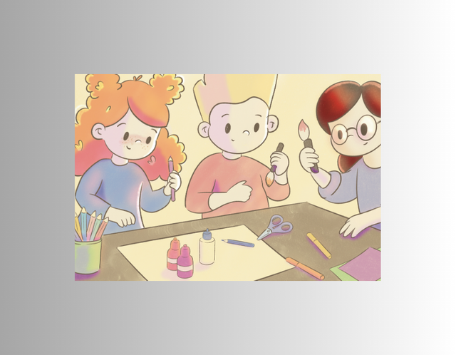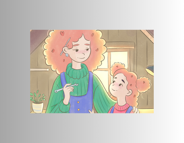 – Illustration de Mia et sa maman dans l'atelier.