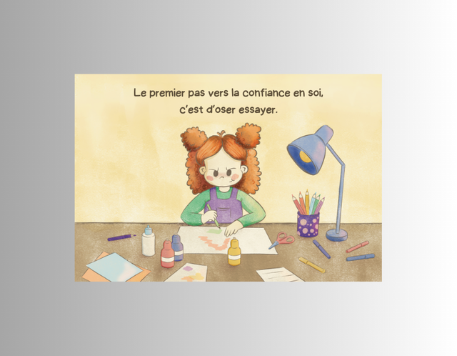 – Illustration Mia avec le message : "Le premier pas vers la confiance en soi, c’est d’oser essayer."